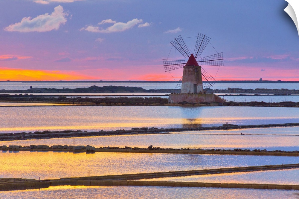 <p>Italy, Sicily, Trapani district, Marsala, Isole dello Stagnone, Mediterranean sea, Tyrrhenian sea, Mills at sunset at the Ettore Infersa Saline.</p>
