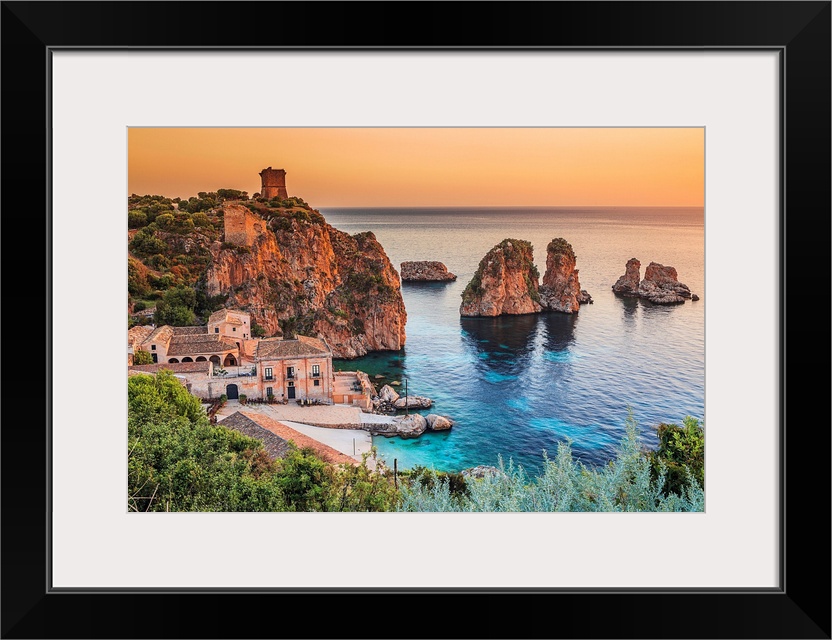 <p>Italy, Sicily, Mediterranean sea, Trapani district, Scopello, Tonnara and faraglioni, sea stacks.</p>