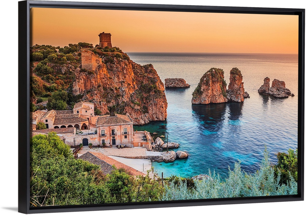 <p>Italy, Sicily, Mediterranean sea, Trapani district, Scopello, Tonnara and faraglioni, sea stacks.</p>