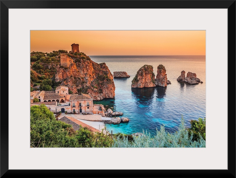 <p>Italy, Sicily, Mediterranean sea, Trapani district, Scopello, Tonnara and faraglioni, sea stacks.</p>