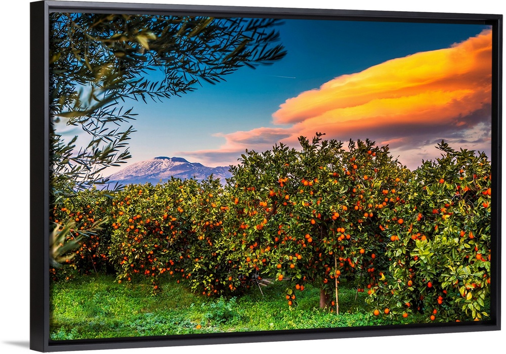 <p>Italy, Sicily, Catania district, Paterno, Orange groves, area of Ponte Barca near Paterno, Mount Etna in background.</p>