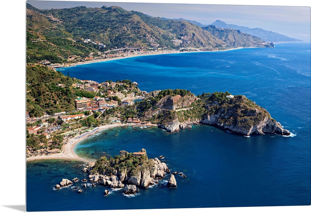 <p>Italy, Sicily, Mediterranean sea, Messina district, Taormina, Aerial view of Isola Bella and Sant'Andrea cape</p>