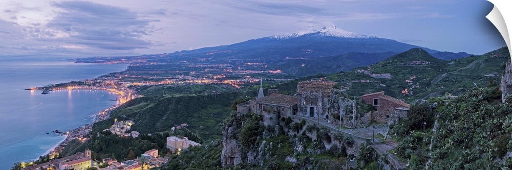<p>Italy, Sicily, Taormina, Mediterranean area, Mediterranean sea, Messina district, Travel Destination, View of the Ionic Coast from Taormina to Catania with sanctuary of Madonna della Rocca and Mount Etna in background</p>