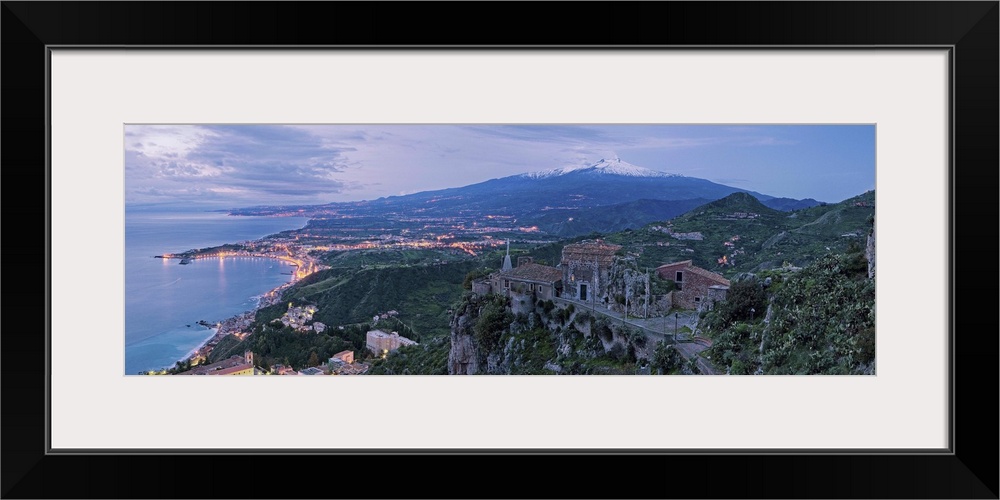 <p>Italy, Sicily, Taormina, Mediterranean area, Mediterranean sea, Messina district, Travel Destination, View of the Ionic Coast from Taormina to Catania with sanctuary of Madonna della Rocca and Mount Etna in background</p>