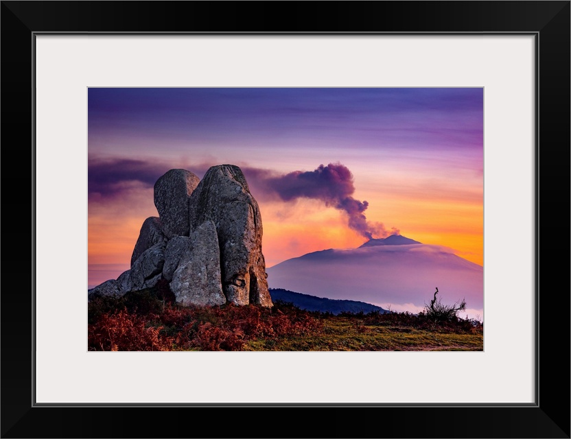 <p>Italy, Sicily, Messina district, Argimusco, The Eagle, megalith of Argimusco near Montalbano Elicona and eruption of Mount Etna in the background.</p>