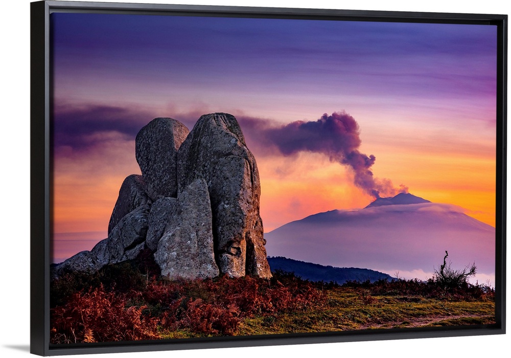 <p>Italy, Sicily, Messina district, Argimusco, The Eagle, megalith of Argimusco near Montalbano Elicona and eruption of Mount Etna in the background.</p>