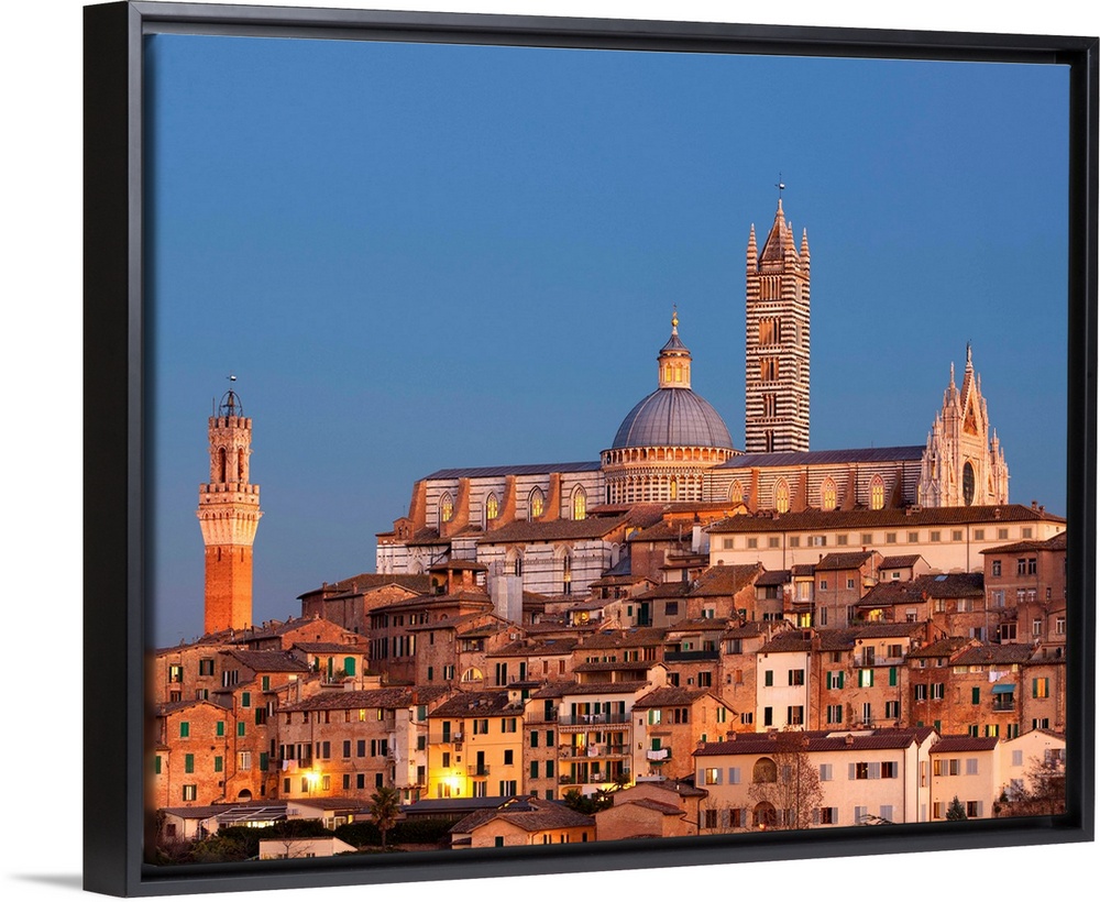 <p>Italy, Tuscany, Siena district, Siena, City at sunset with the cathedral in the background and Torre del Mangia tower on the left.</p>