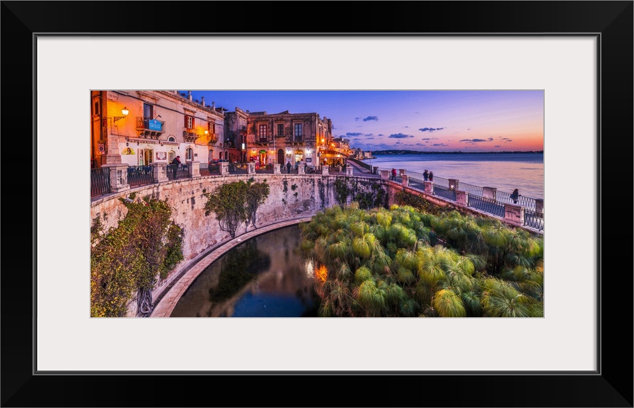 <p>Italy, Sicily, Siracusa district, Siracusa, Ortigia, Alfeo seafront at dusk, Fonte Aretusa.</p>