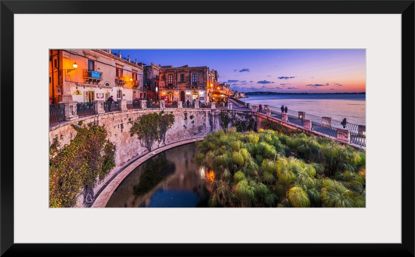 <p>Italy, Sicily, Siracusa district, Siracusa, Ortigia, Alfeo seafront at dusk, Fonte Aretusa.</p>