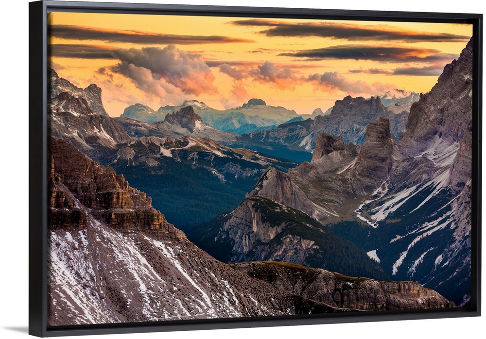 <p>Italy, South Tyrol, Dolomiti di Sesto Natural Park, View from Sasso di Sesto towards Tofana, Cristallo and Sorapiss mountains at sunset.</p>