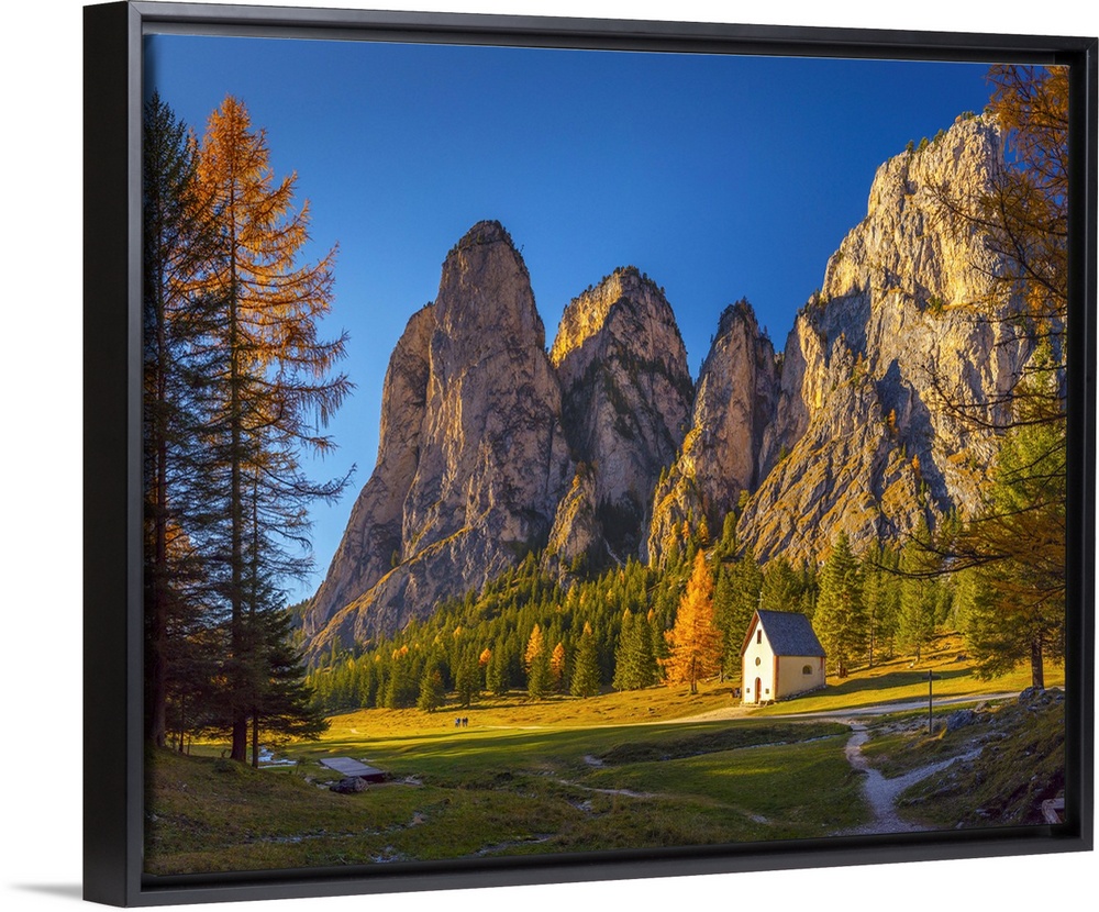 <p>Italy, Trentino-Alto Adige, Alto Adige, Sudtirol, Alps, Bolzano district, Gardena Valley, Selva di Val Gardena, Vallunga, Chapel of San Silvestro and Piz dai Schic.</p>
