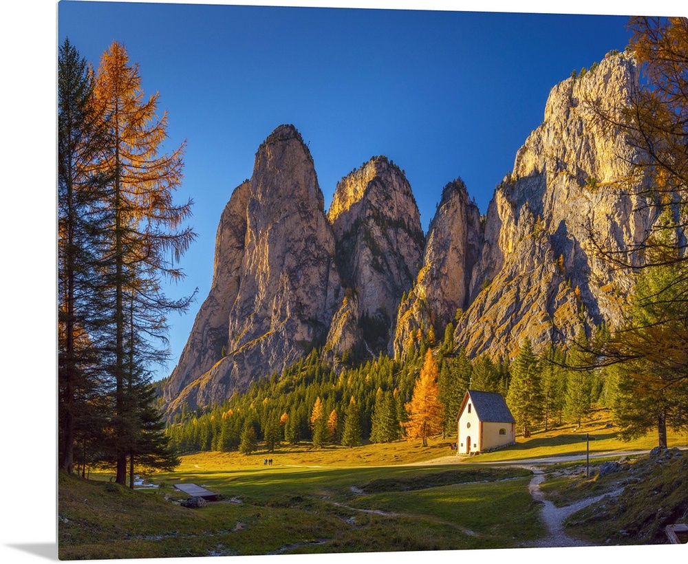 <p>Italy, Trentino-Alto Adige, Alto Adige, Sudtirol, Alps, Bolzano district, Gardena Valley, Selva di Val Gardena, Vallunga, Chapel of San Silvestro and Piz dai Schic.</p>