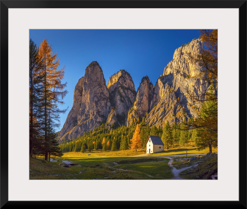 <p>Italy, Trentino-Alto Adige, Alto Adige, Sudtirol, Alps, Bolzano district, Gardena Valley, Selva di Val Gardena, Vallunga, Chapel of San Silvestro and Piz dai Schic.</p>