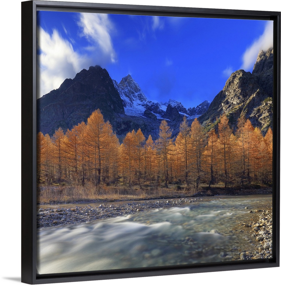 <p>Italy, Aosta Valley, Courmayeur, Val Ferret, Alps, The Dora di Ferret torrent and autumn larches, in background the east face of Grandes Jorasse, on the left, Mont Blanc group.</p>