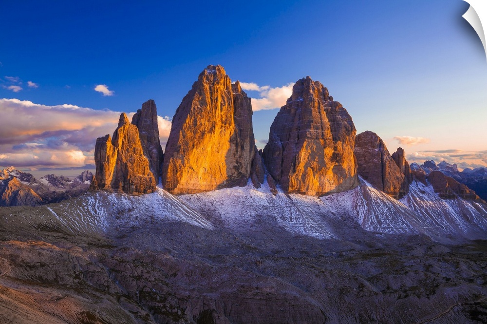 <p>Italy, Trentino-Alto Adige, Alps, Dolomites, Bolzano district, South Tyrol, Alta Pusteria, Dolomiti di Sesto Natural Park, Tre Cime di Lavaredo, Drei Zinnen, view from Sasso di Sesto at sunset</p>
