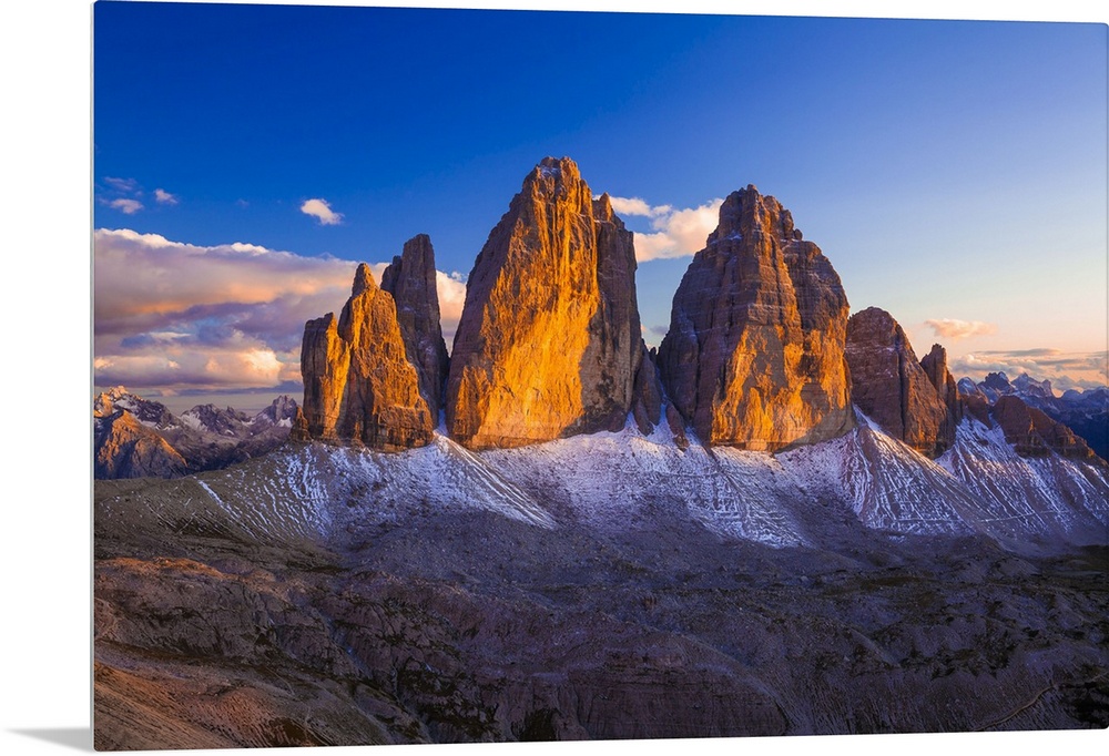 <p>Italy, Trentino-Alto Adige, Alps, Dolomites, Bolzano district, South Tyrol, Alta Pusteria, Dolomiti di Sesto Natural Park, Tre Cime di Lavaredo, Drei Zinnen, view from Sasso di Sesto at sunset</p>