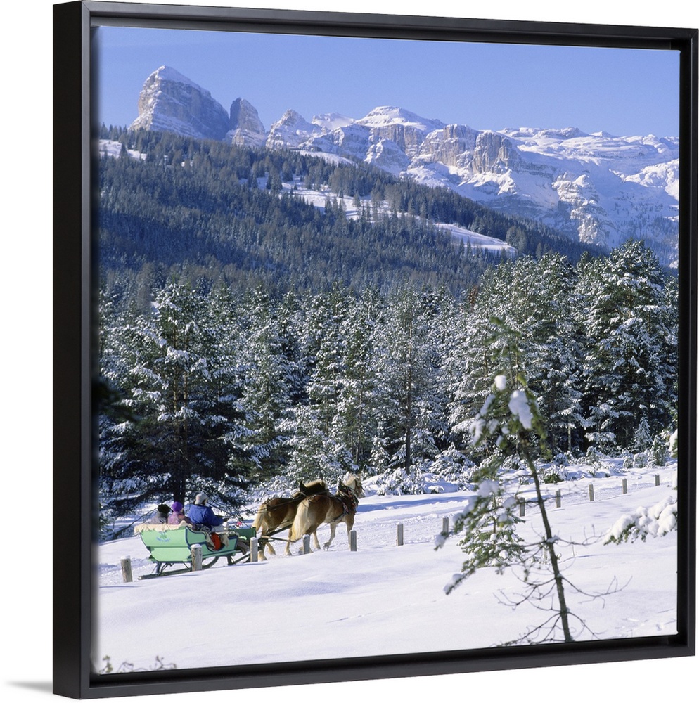 <p>Italy, Trentino-Alto Adige, South Tyrol, Dolomites, Alps, Sellaronda, Alta Badia, Armentarola, Horse drawn sledge with Puez and Sassongher mounts in background</p>