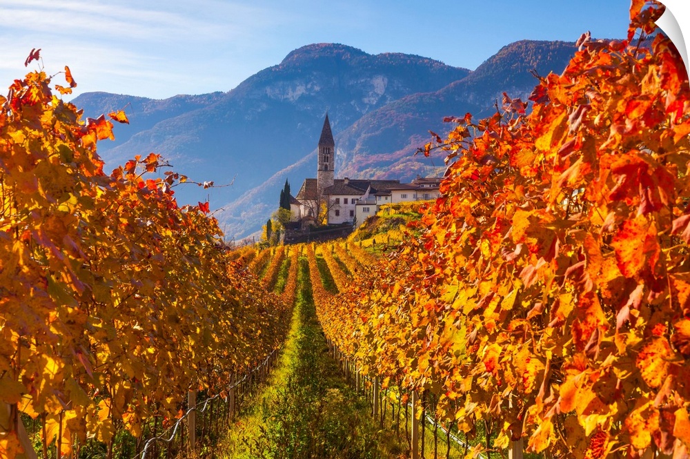 <p>Italy, Trentino-Alto Adige, Alps, Bolzano district, South Tyrol, South Tyrolean Wine Road, Cortaccia, Church and vineyards in autumn.</p>