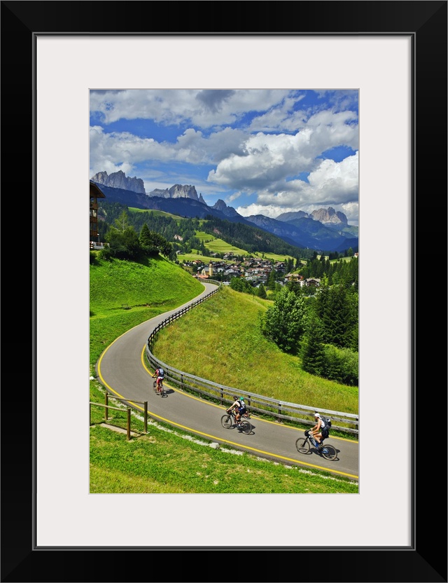 <p>Pista ciclabile della val di Fassa presso paese di Soraga con gruppi del Catinaccio, Larsec e Sassolungo-TN</p>