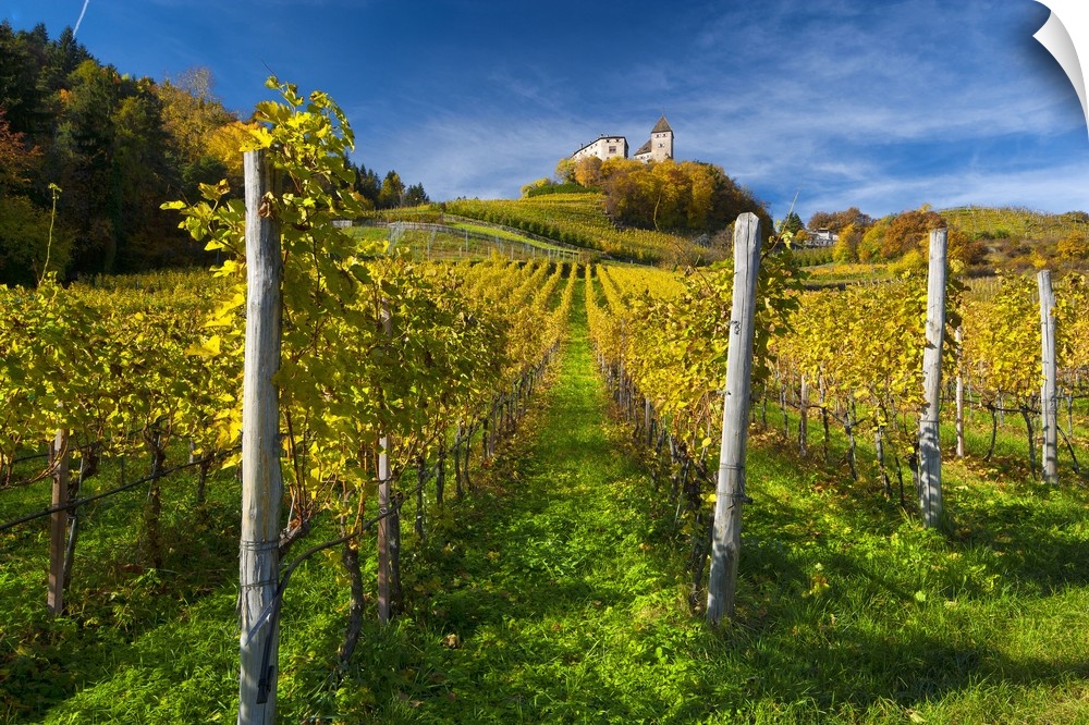 <p>Italy, Trentino-Alto Adige, Alps, Dolomites, Bolzano district, South Tyrol, Prissiano, Castel Wehrburg and vineyards in autumn</p>