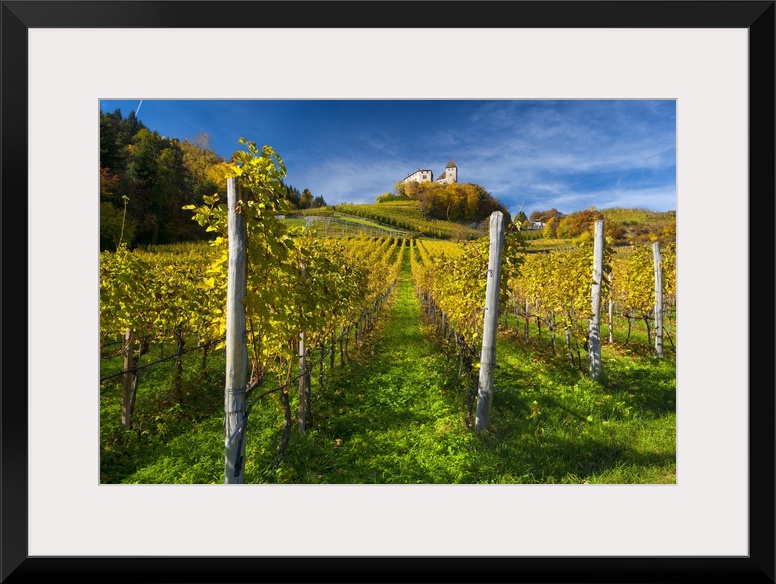 <p>Italy, Trentino-Alto Adige, Alps, Dolomites, Bolzano district, South Tyrol, Prissiano, Castel Wehrburg and vineyards in autumn</p>