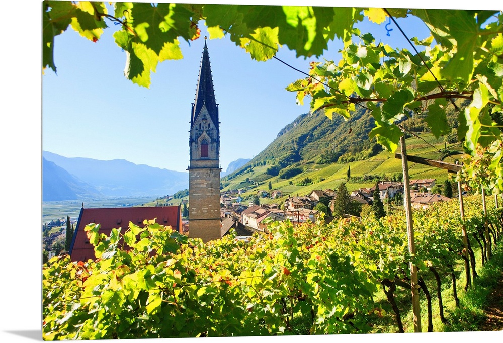 <p>Italy, Trentino-Alto Adige, Bolzano district, South Tyrol, South Tyrolean Wine Road, Termeno, Alps, Vineyards near the village.</p>