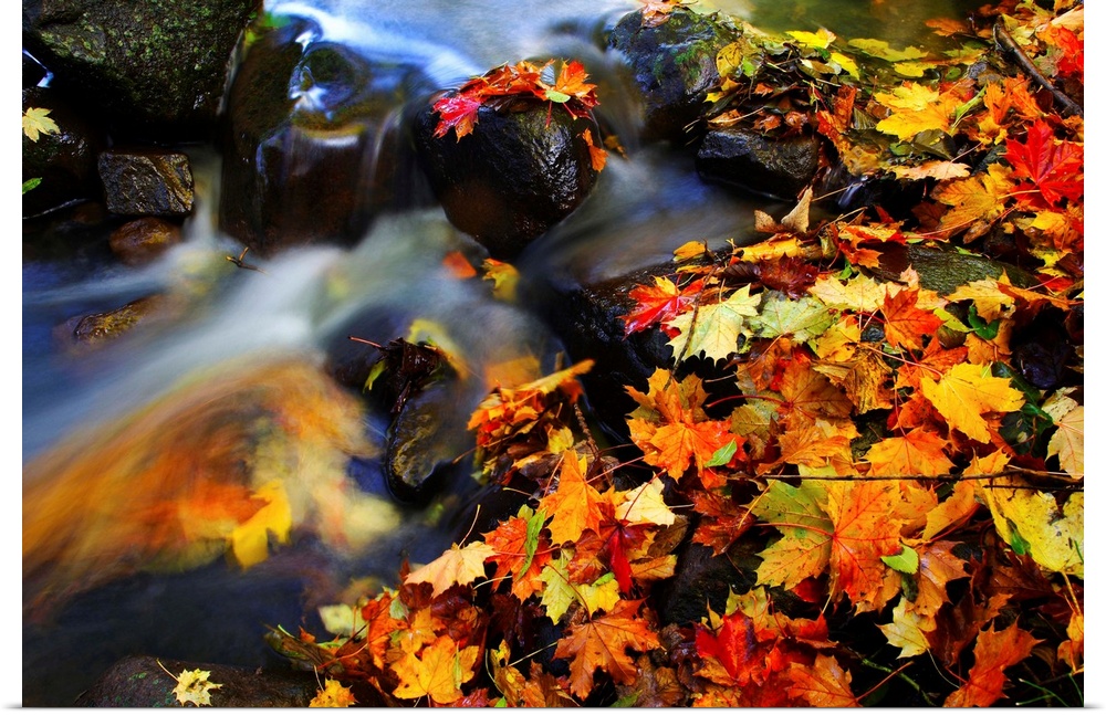 <p>Italy, Trentino-Alto Adige, Trentino, Alps, Stream and maple leaves</p>