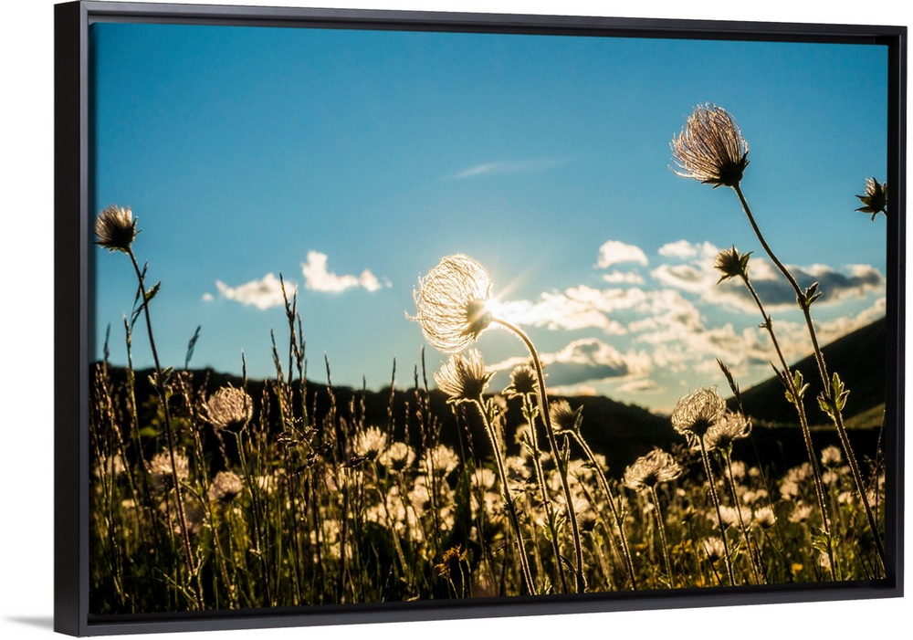 <p>Italy, Trentino, San Martino di Castrozza, Mountain flowers transparency with sun through light at Sunset.</p>