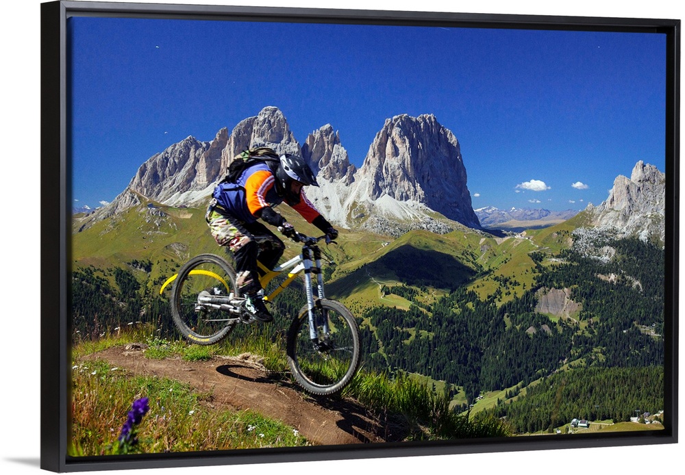 <p>Italy, Trentino-Alto Adige, Alps, Dolomites, Trento district, Trentino, Val di Fassa, Canazei, Mountain bike at Belvedere, view towards Sassolungo.</p>