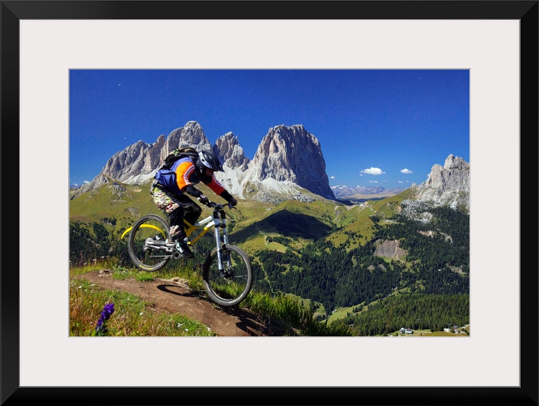 <p>Italy, Trentino-Alto Adige, Alps, Dolomites, Trento district, Trentino, Val di Fassa, Canazei, Mountain bike at Belvedere, view towards Sassolungo.</p>