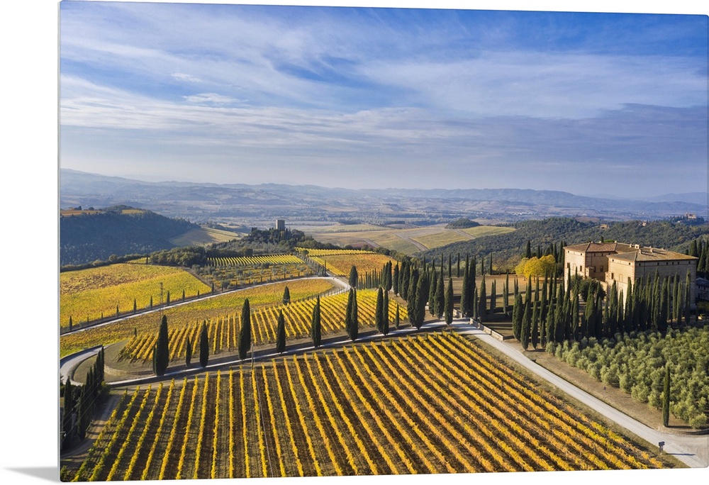 <p>Italy, Tuscany, Brunello wine road, Siena district, Orcia Valley, Montalcino, View of the Podere di Argiano with the Villa Bell'Aria.</p>