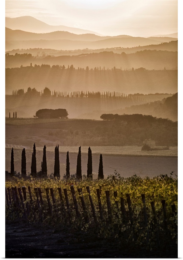 <p>Italy, Tuscany, Brunello wine road, Siena district, Orcia Valley, Montalcino, Landscape with vineyards.</p>