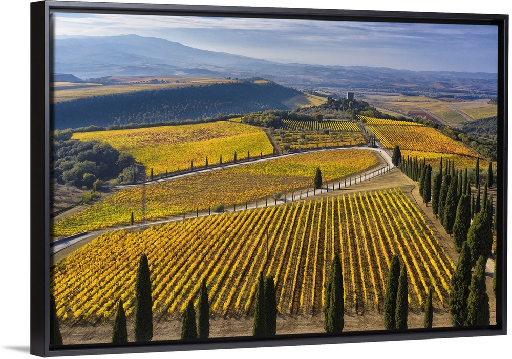 <p>Italy, Tuscany, Brunello wine road, Siena district, Orcia Valley, Montalcino, Vineyards of the Podere di Argiano and the castle in the background.</p>