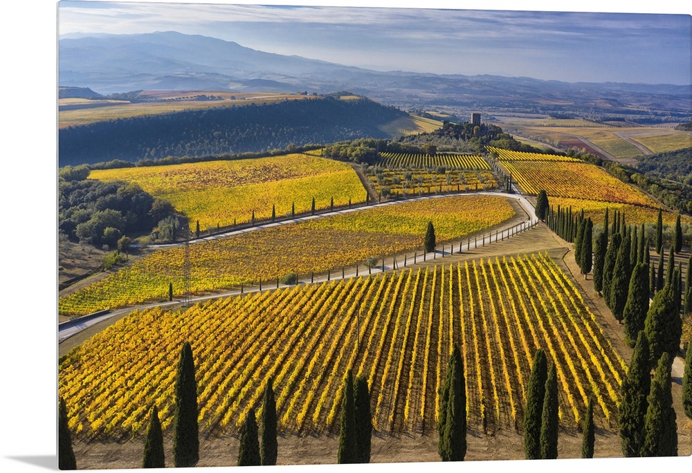 <p>Italy, Tuscany, Brunello wine road, Siena district, Orcia Valley, Montalcino, Vineyards of the Podere di Argiano and the castle in the background.</p>