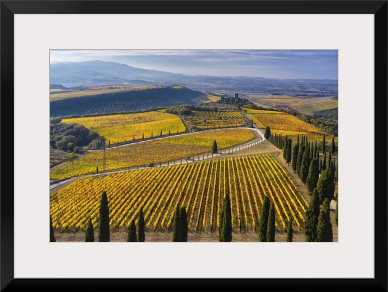 <p>Italy, Tuscany, Brunello wine road, Siena district, Orcia Valley, Montalcino, Vineyards of the Podere di Argiano and the castle in the background.</p>
