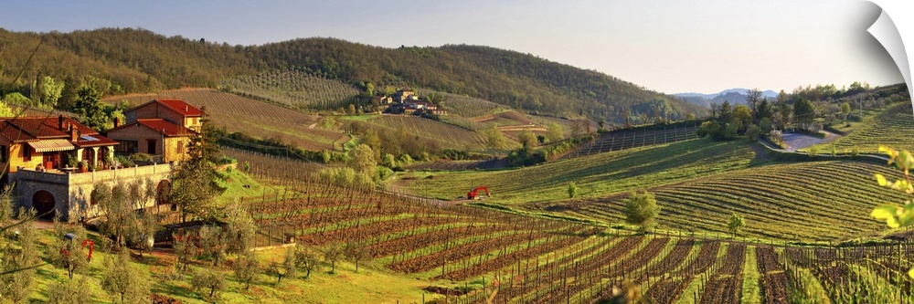 <p>Italy, Tuscany, Mediterranean area, Siena district, Chianti, Castellina in Chianti, Vineyards at sunset</p>