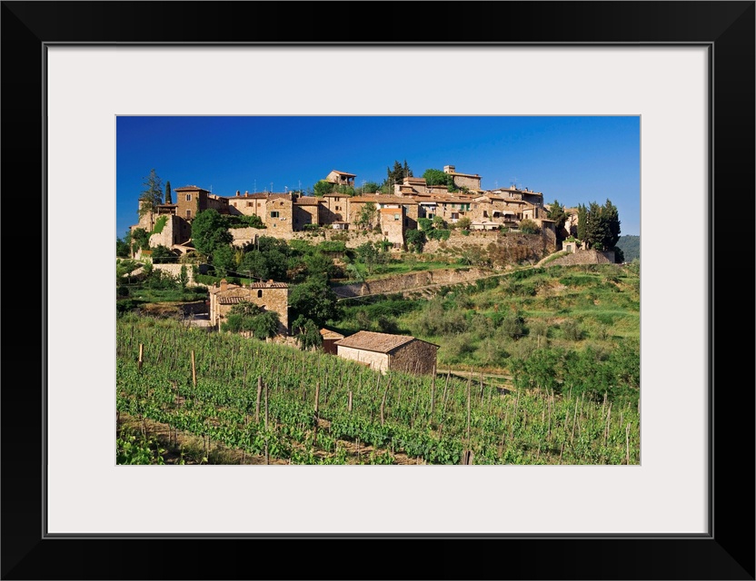 <p>View of the medieval village of Montefioralle, perched on a hill surrounded by vineyards and olive trees near Greve in Chianti.</p>