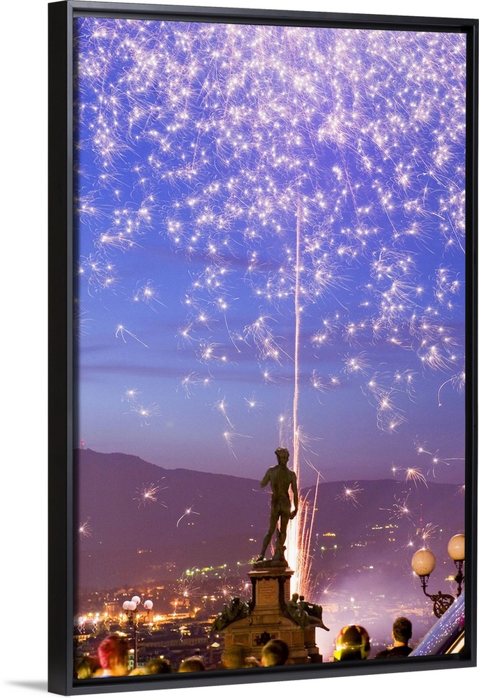 <p>Italy, Tuscany, Florence, Michelangelo's David statue at Piazzale Michelangelo under fireworks</p>