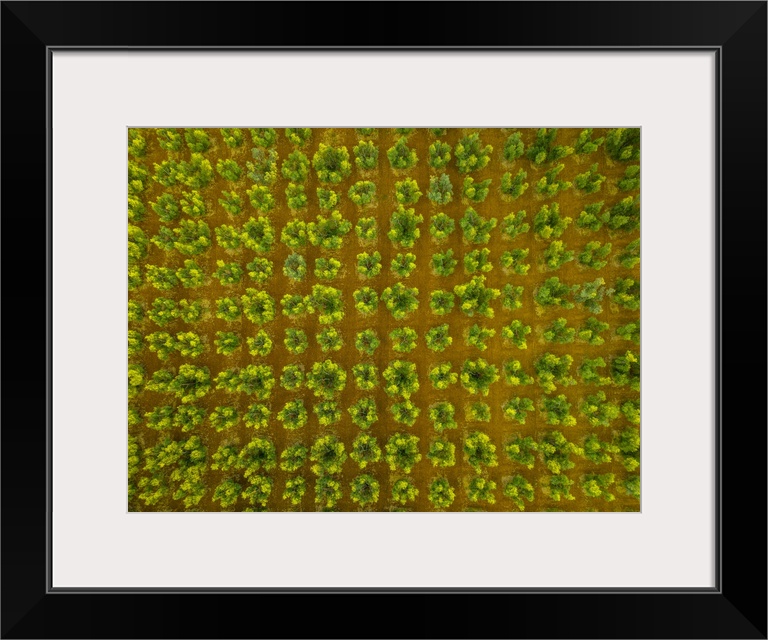 <p>Italy, Tuscany, Grosseto district, Maremma, Grosseto, Istia d'Ombrone locality, stunning top view of an olive trees field in the Tuscan Maremma at sunset.</p>
