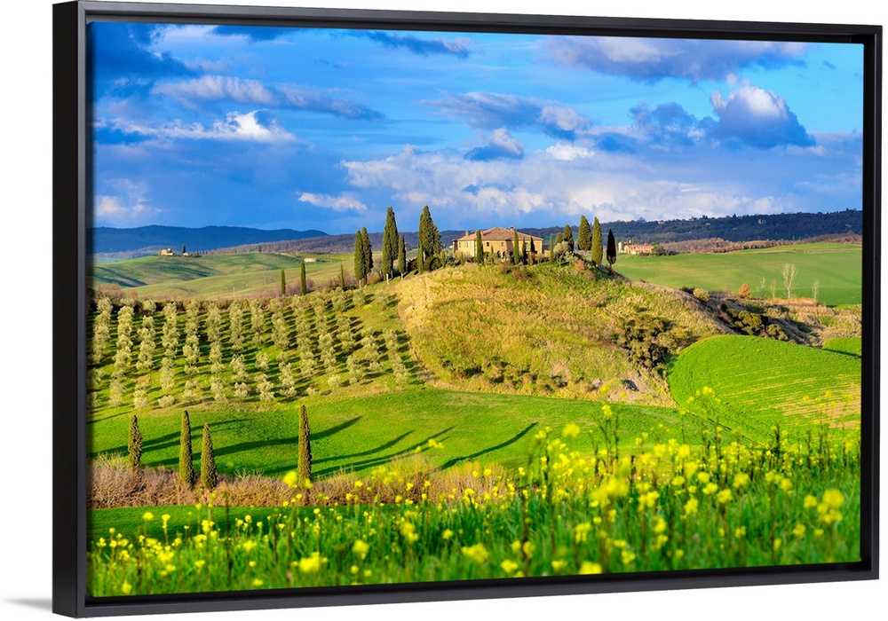<p>Italy, Tuscany, Siena district, Orcia Valley, Hilly landscape with farmhouse and blooming fields.</p>