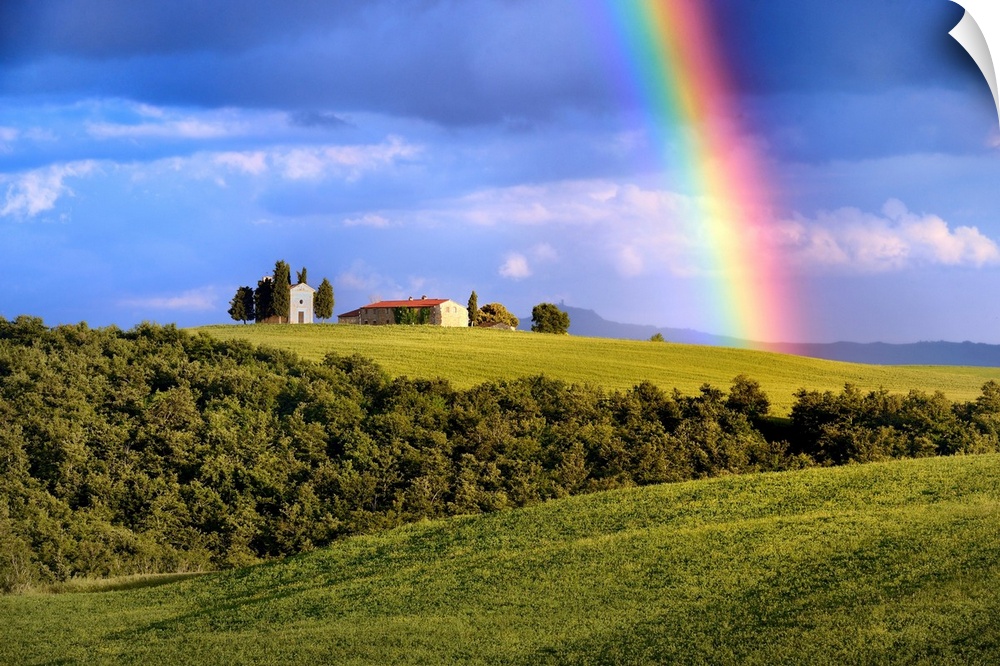 <p>Italy, Tuscany, Siena district, Orcia Valley, the Chapel of Vitaleta with a rainbow over it.</p>