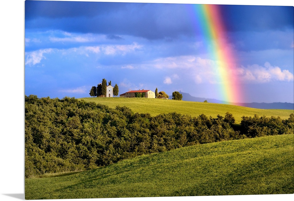 <p>Italy, Tuscany, Siena district, Orcia Valley, the Chapel of Vitaleta with a rainbow over it.</p>