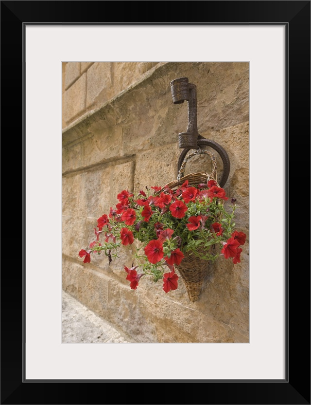 <p>Italy, Tuscany, Pienza. Colorful petunias spill from a basket on a stone wall.</p>