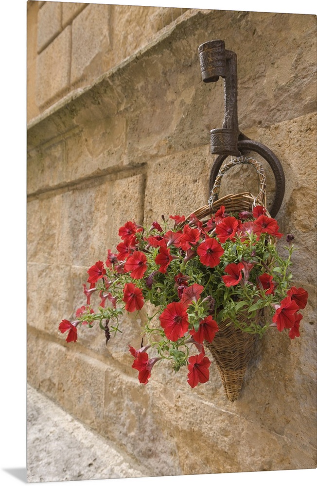 <p>Italy, Tuscany, Pienza. Colorful petunias spill from a basket on a stone wall.</p>
