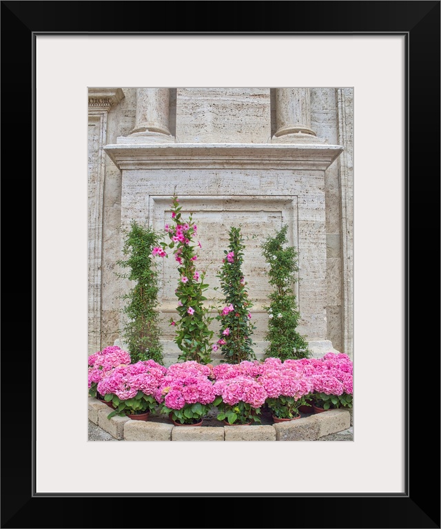 <p>Italy, Tuscany, Pienza. Flowers in front of Pienza Cathedral.</p>