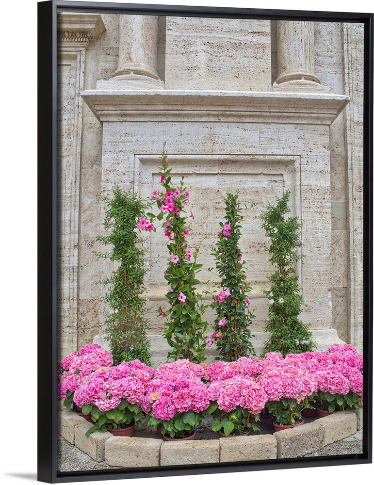<p>Italy, Tuscany, Pienza. Flowers in front of Pienza Cathedral.</p>
