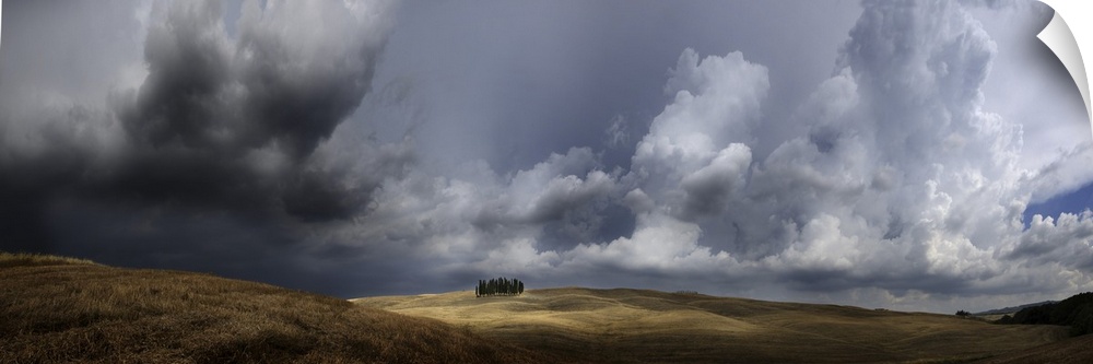 <p>Italy, Tuscany, San Quirico d'Orcia, Storm over group of cypress trees.</p>