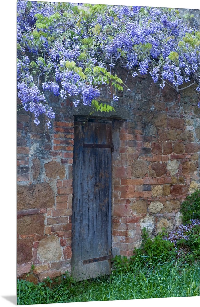 <p>Italy, Tuscany. Wisteria blossoms hang over an old doorway in Pienza.</p>
