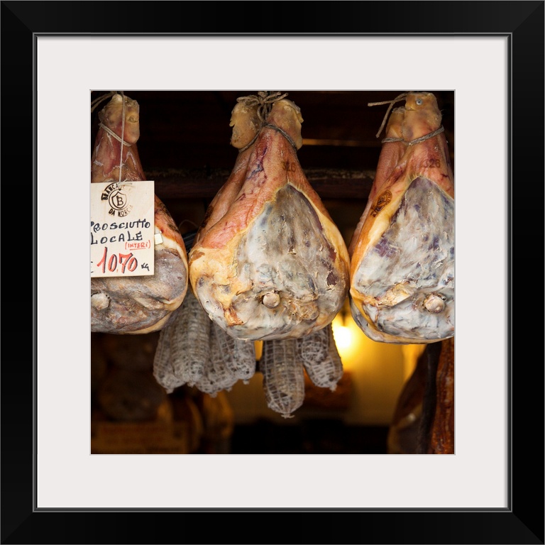 <p>Italy, Umbria, Perugia district, Apennines, Appennini, Monti Sibillini National Park, Norcia, The famous Norcia's ham exposed in one of the many shops in the old town</p>