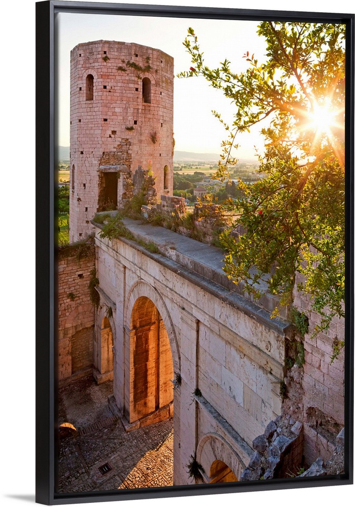 <p>Italy, Umbria, Mediterranean area, Perugia district, Spello, Porta Venere (gate) and Torri di Properzio (towers) at sunset</p>